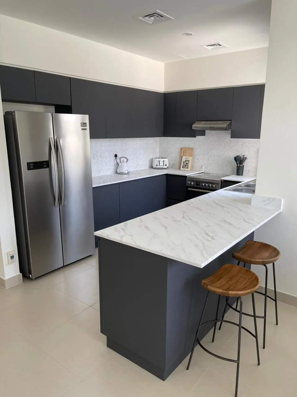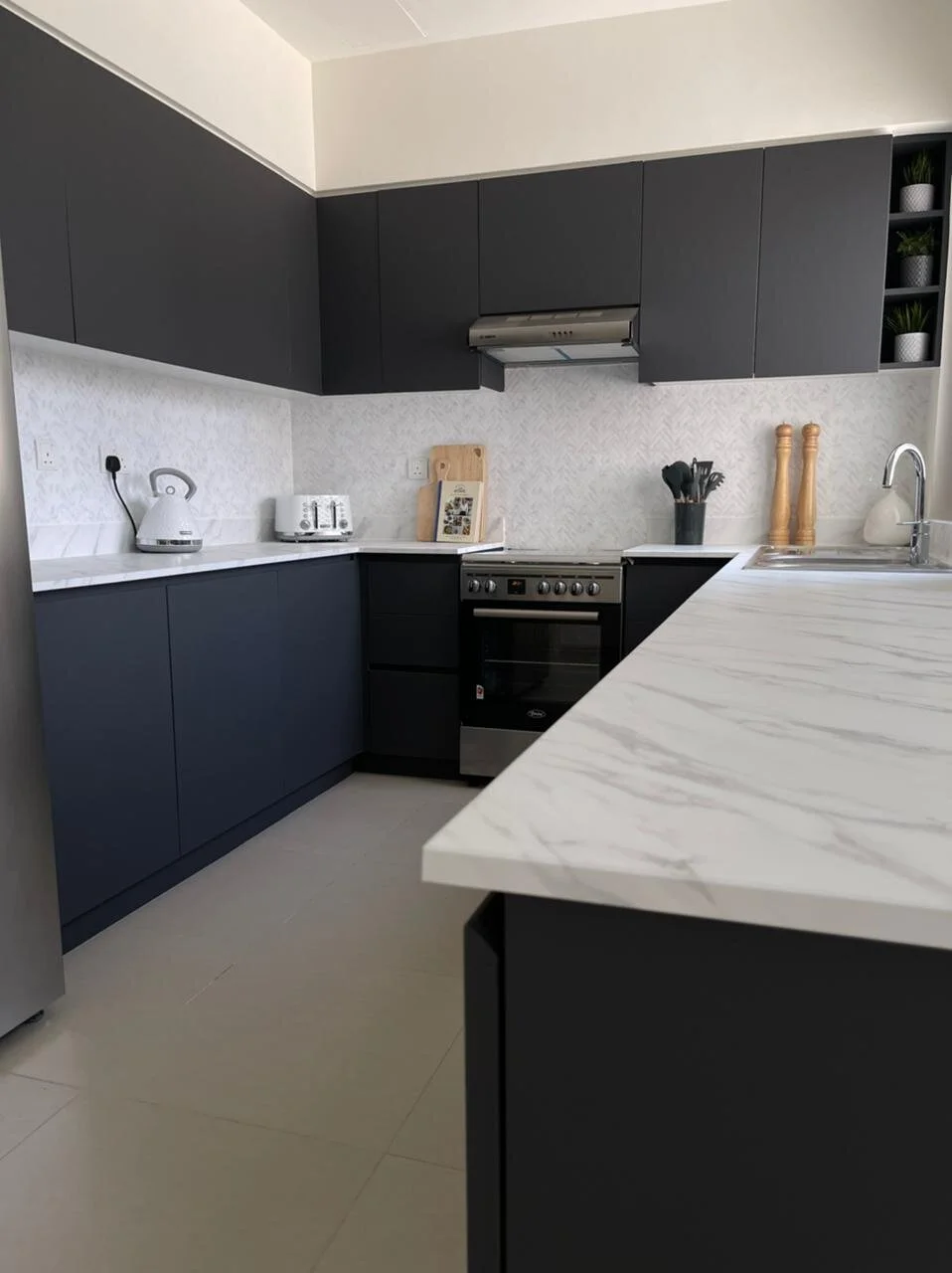 This rental townhouse in Dubai Hills was no exception. We set out to find the quickest budget-friendly solution to inject some life into this space – wrapping the cabinets and countertop with architectural vinyl, and covering the tiles with self-adhesive tile blocks was the plan and it didn’t disappoint.